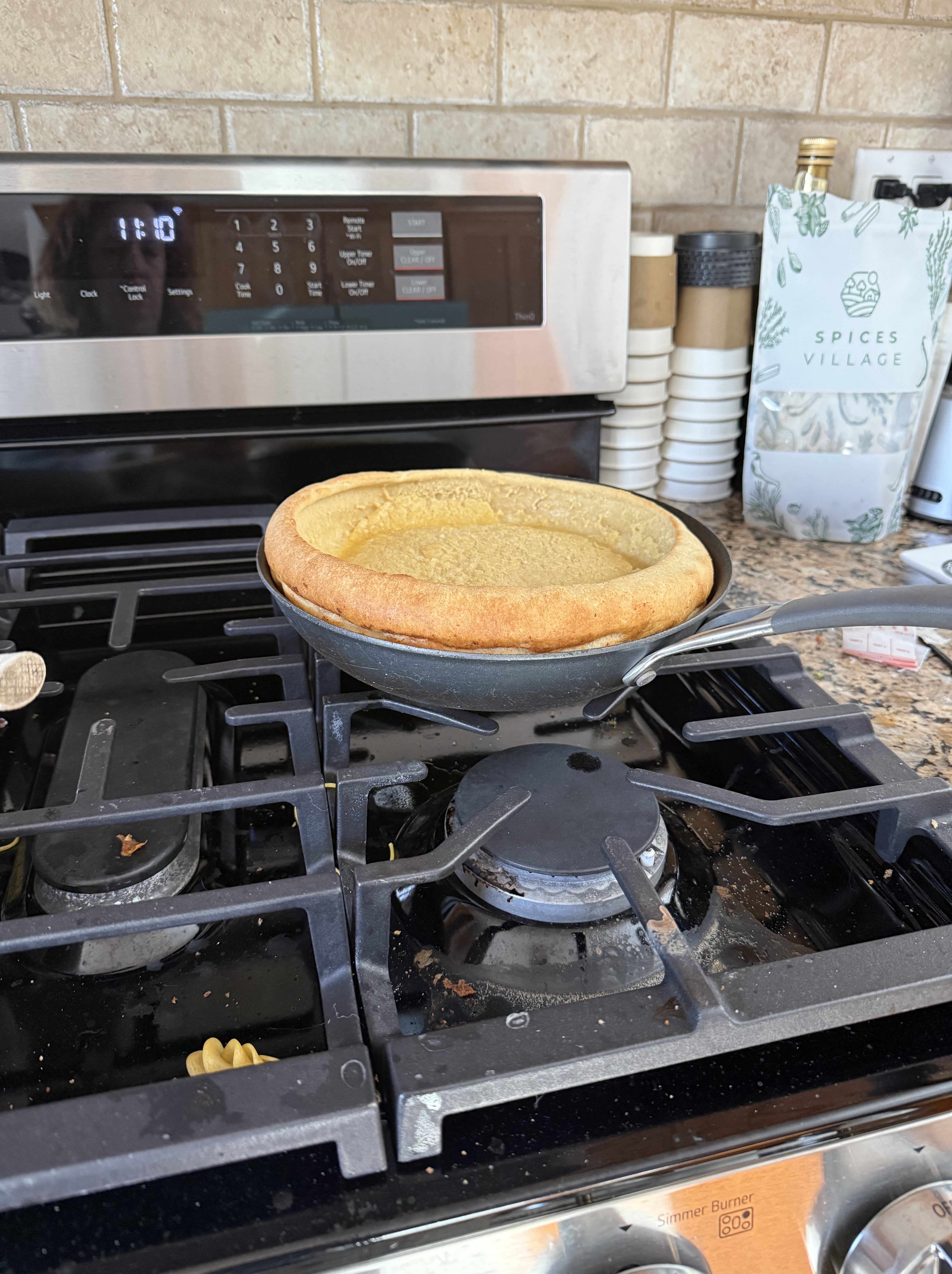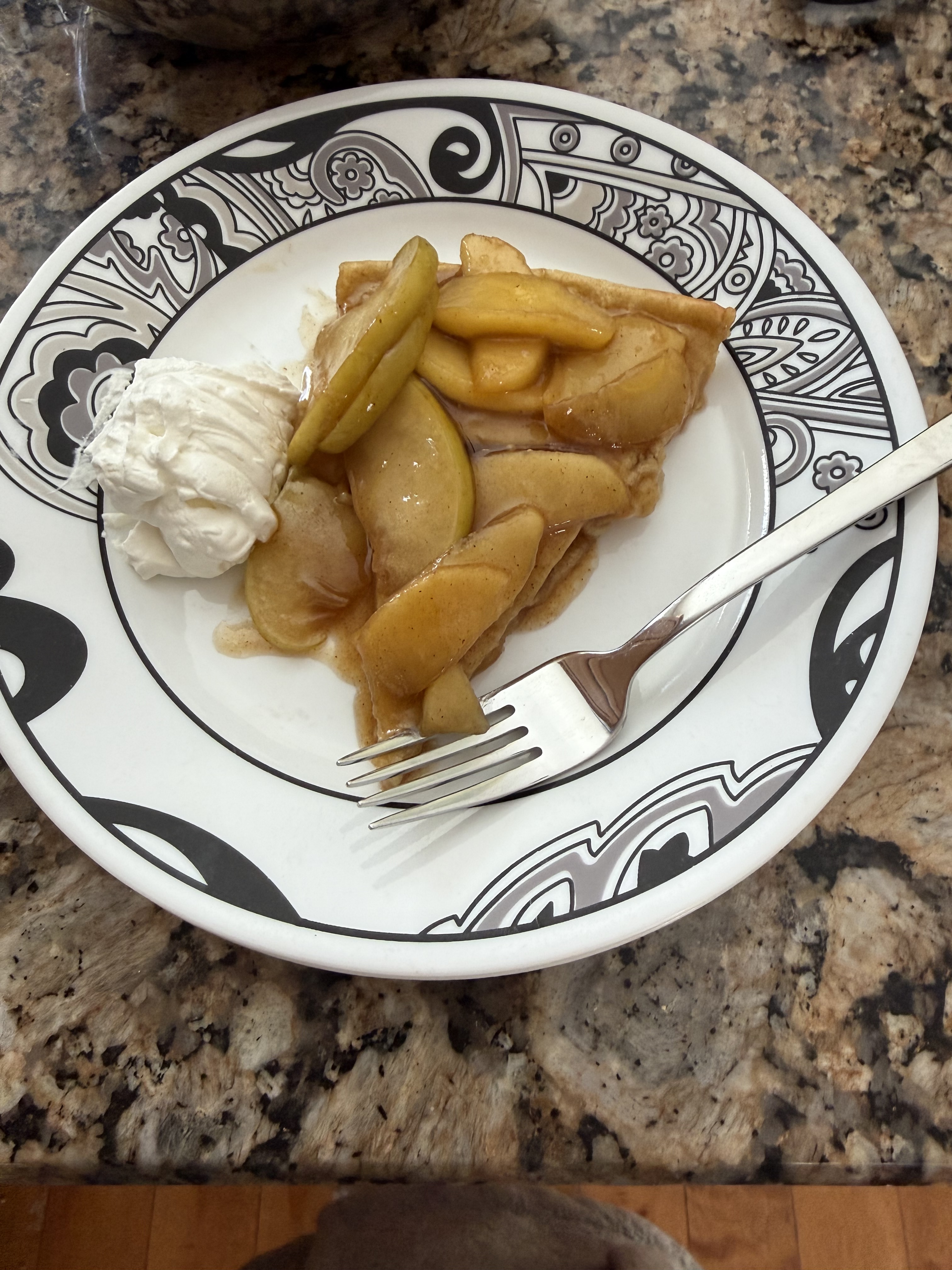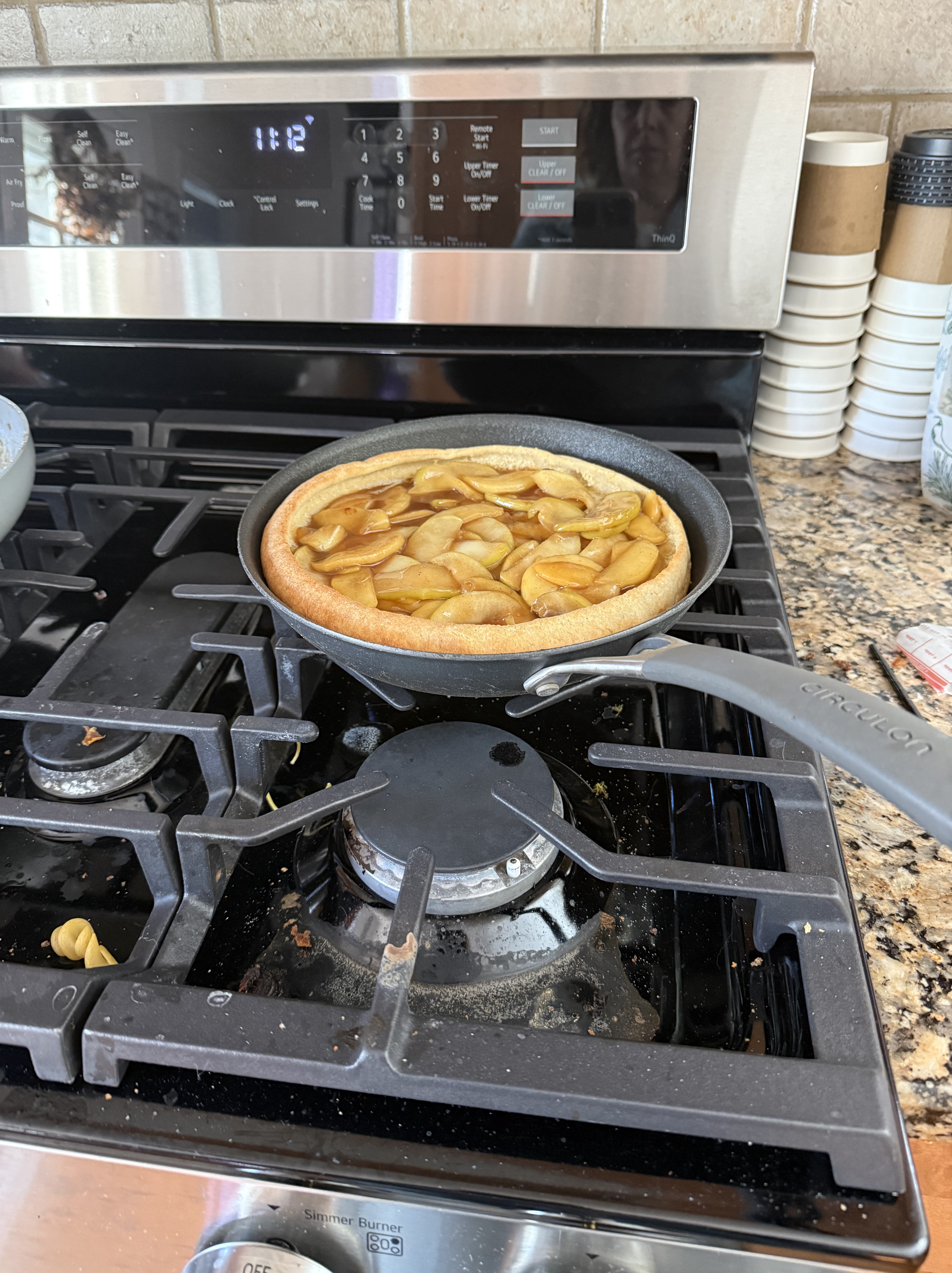 This morning Booth and the blessed child were sleeping in. We tend to have “Sweet Breakfast” at least one day on the weekends. The plan was a tube of store bought cinnamon rolls. However, I woke up at 7 and was itchy for something to do. I decided to make something I have never made before, but always wanted to try. A Dutch Baby pancake. I turned to the master chef of google and found a recipe on one of my favorite sites: Sally’s Baking Addiction. I don’t have a whole lot of fresh fruit in the house today, but we always have apples, so while the Dutch Baby was baking I found a recipe for sautéed cinnamon apples in butter, I used maple syrup to sweeten them instead of brown sugar. Once the apples came together I filled my puffed up dutch baby with the apples and served with fresh whipped cream when Booth and the blessed child finally woke up.